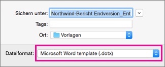 2. Wählen Sie als Dateityp das entsprechende Vorlagenformat (.dotx) aus und speichern diese ab.
